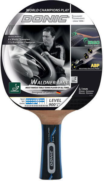 Donic ma az egyik legkeresettebb márkák asztalitenisz versenyeken. A Waldner ütősorozat a legendás Donic játékos Jan-Ove Waldner tiszteletére készült. Jan-Ove Waldner a világon még ma is a legjobb játékosok közé tartozik a sportág történetében. A Donic Waldner 900-as pingpongütő ERGO (ergonomikus) nyelével anatómiailag tökéletesen illeszkedik a kézhez. Agresszív, gyors, támadó játékstílushoz ajánlott. Az új formájú fa rész különösen kényelmes és kellemes fogantyúzást biztosít. Az ABP technológiával készült, mely lehetővé teszi a pingpongütő egyensúlyának egyedi beállítását az egyes játékstílusokhoz igazítva. A pingpongütő fej irányába mutató súlyeloszlás erőteljesebb teljesítményt nyújt a támadási stílushoz. A kézhez közelebbi súlypont a pontosabb játékot biztosít. Egyszerűen kapcsolja be, húzza és állítsa be! Kiváló minőségű pingpongütő! Technikai adatok: - Sebesség: 90 - Csavarás: 90 - Irányítás: 60 - 2,1 mm a gumiborítás vastagsága - Állítható súlypont - Ergonomikus nyél - Ajándék DVD